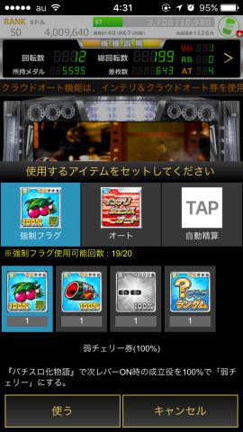 このオートプレイを利用するためには、アイテムの使用か、機種毎のミッション達成率によって利用することができます。
