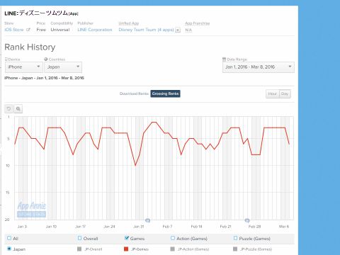 ツムツムも10位以内で安定しているタイトルではありますが、3/8にライオンキングイベントが開始しており、初日ということもあって売上を伸ばしているものと考えます。