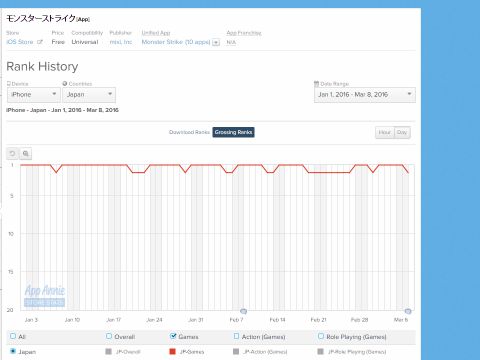 すっかり首位に定着したモンストですが、1/1以降は半分以上の日で首位をキープしています。