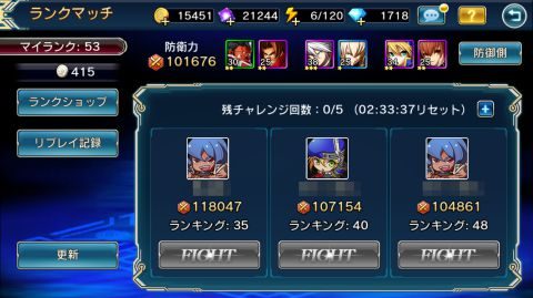 ランクマッチは1日5回挑戦できる他のプレイヤーとの非同期PvPで、自分でキャラクターを操作することはできず、全てオートで進行します。