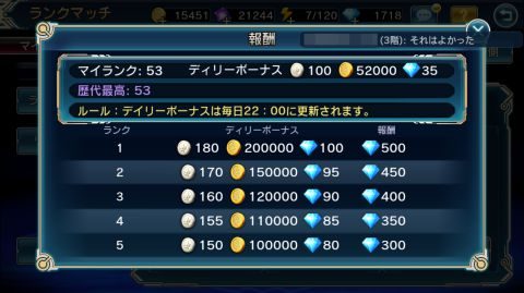 ランクマッチでは最高順位や毎日22:00にランキングの順位に応じてダイヤやコイン(?)等がもらえるので、頑張って上位を目指しましょう!
