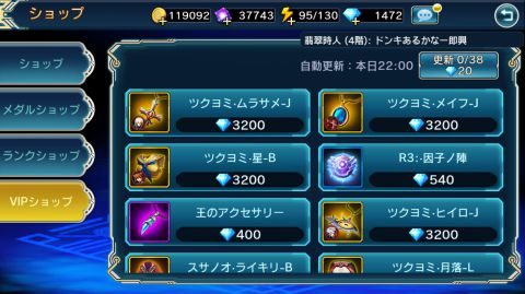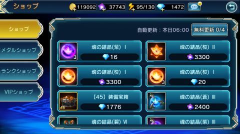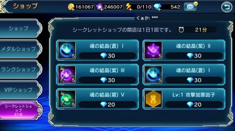 1日に1回、30分間だけ出現するショップで魂の結晶や因子等のアイテムをダイヤで購入することが出来ます。