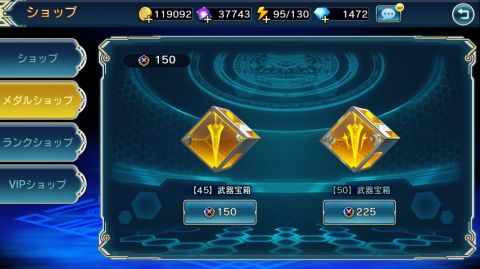メダルショップではレア度45とレア度50の装備宝箱をメダルで購入することが出来ます。