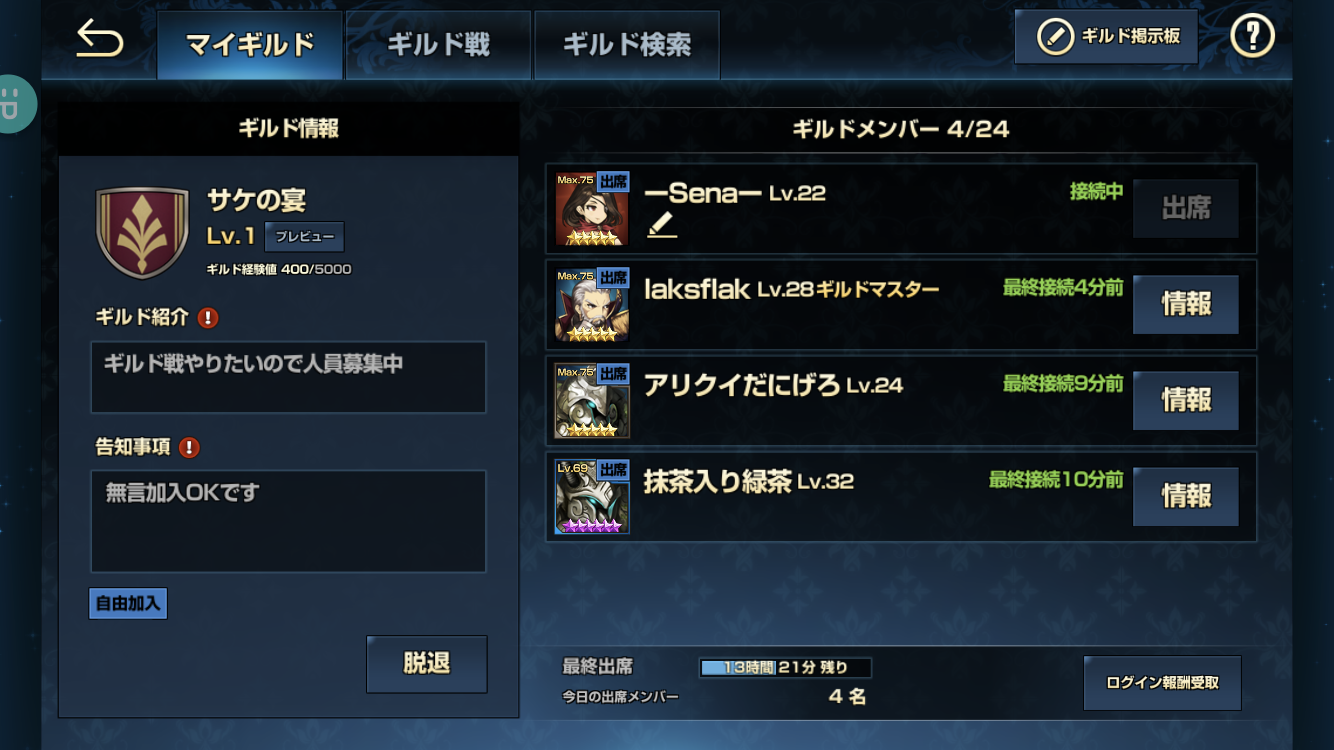 【コメント】ノルマなどは一切なくガチ勢<エンジョイ勢です。みんなでギルド掲示板などを盛り上げつつ楽しくゲームできる団員募集中( •᷄ὤ•᷅)!