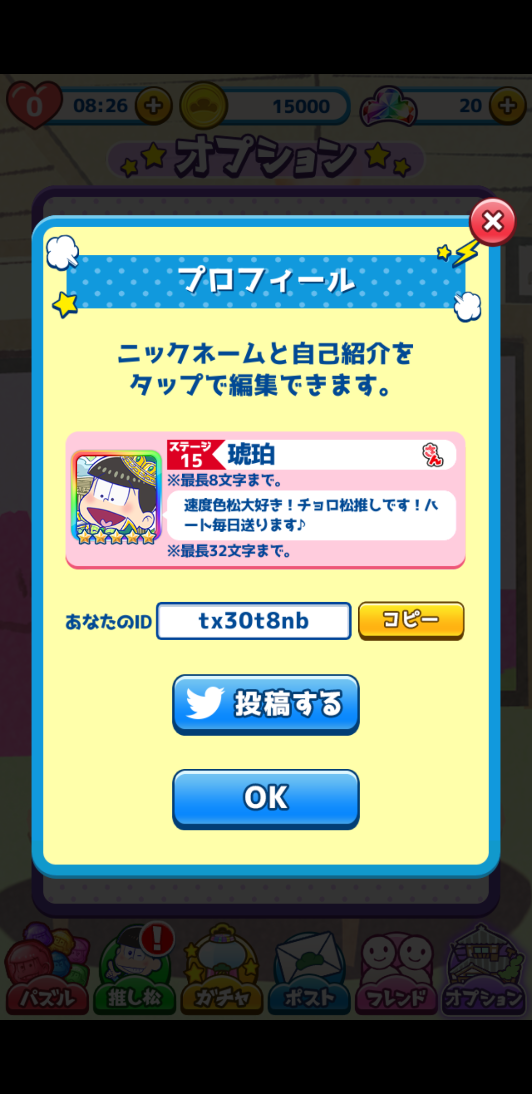 自分のフレンドIDはフッターメニューのオプション⇒プロフィールから確認できます。