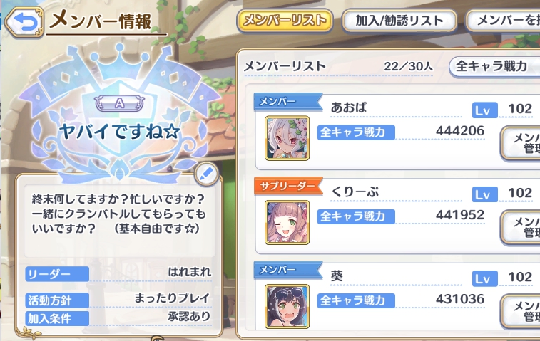まったりとしていて楽しいクランなんで是非一緒に楽しみましょう!レッツプリコネ!!なの~^^ノシ