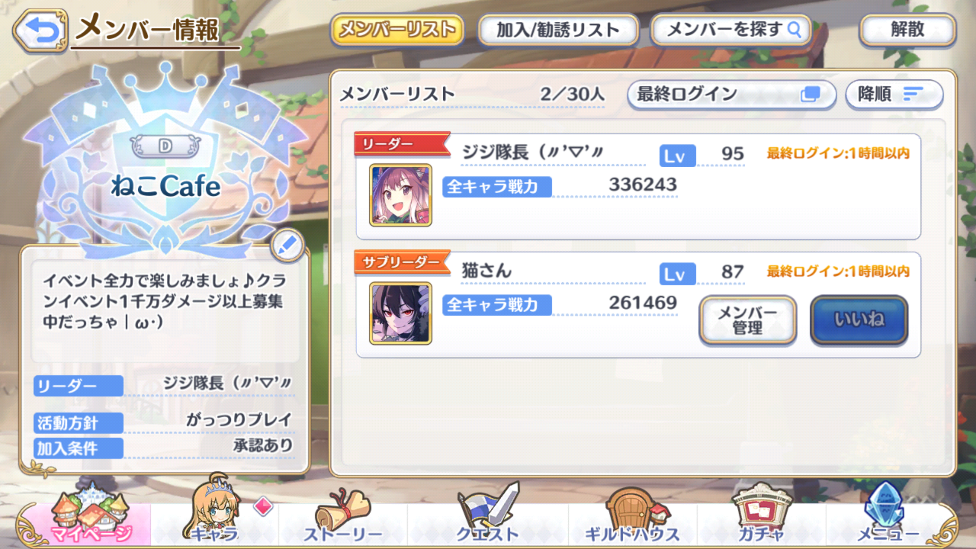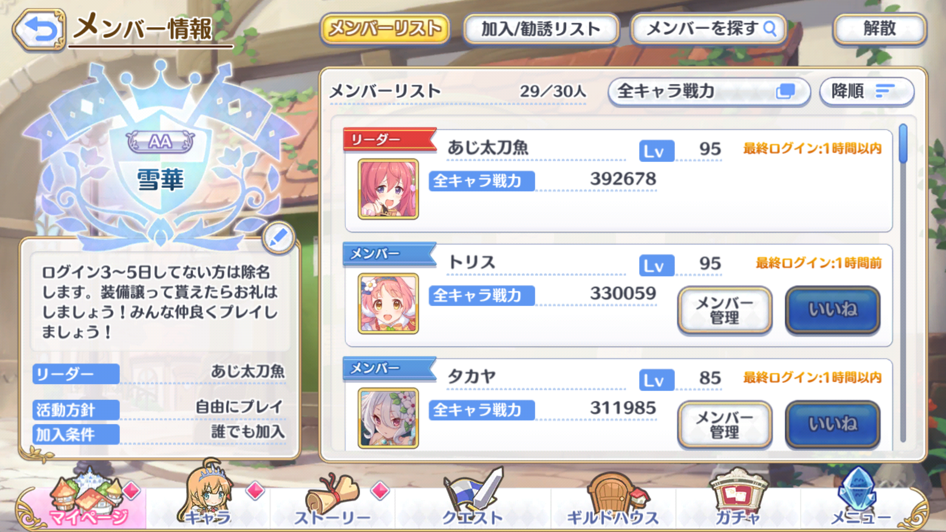 メンバー全員がっつりですが、クラバト期間外はゆる~く雑談やアリーナ編成相談等をして過ごしていますので、徐々に成長したい方、マナーを守ってプレイ、チャットができる方は大歓迎です!