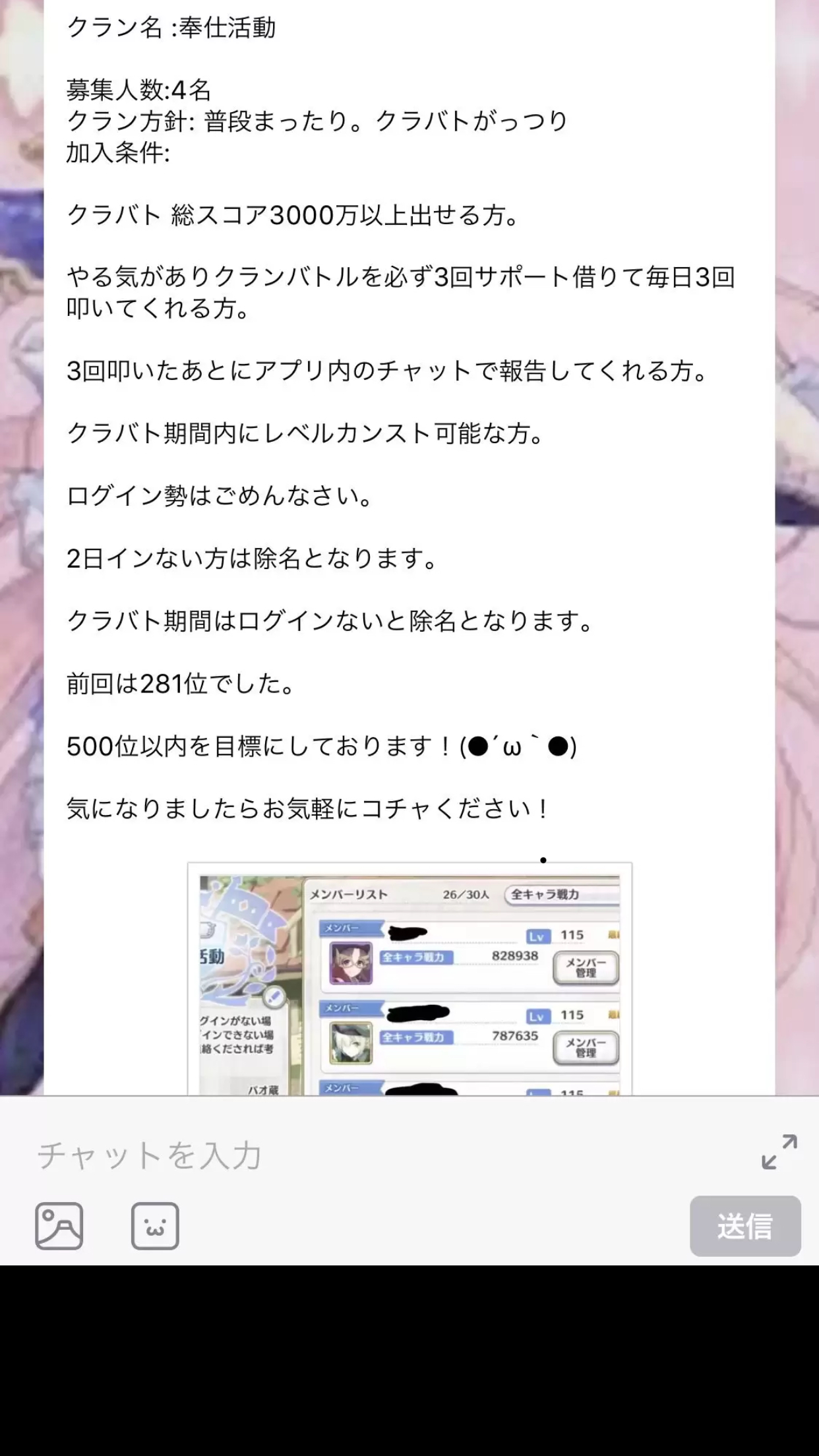 とにかくクランバトルにやる気がある方大募集中です!(*’ω’*)前回124位でしたので、次回は100位以内目指してます!チャット好きな方も募集中です!(*´ω`*)