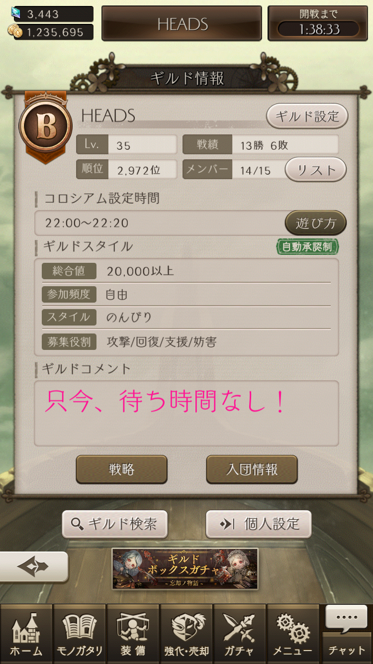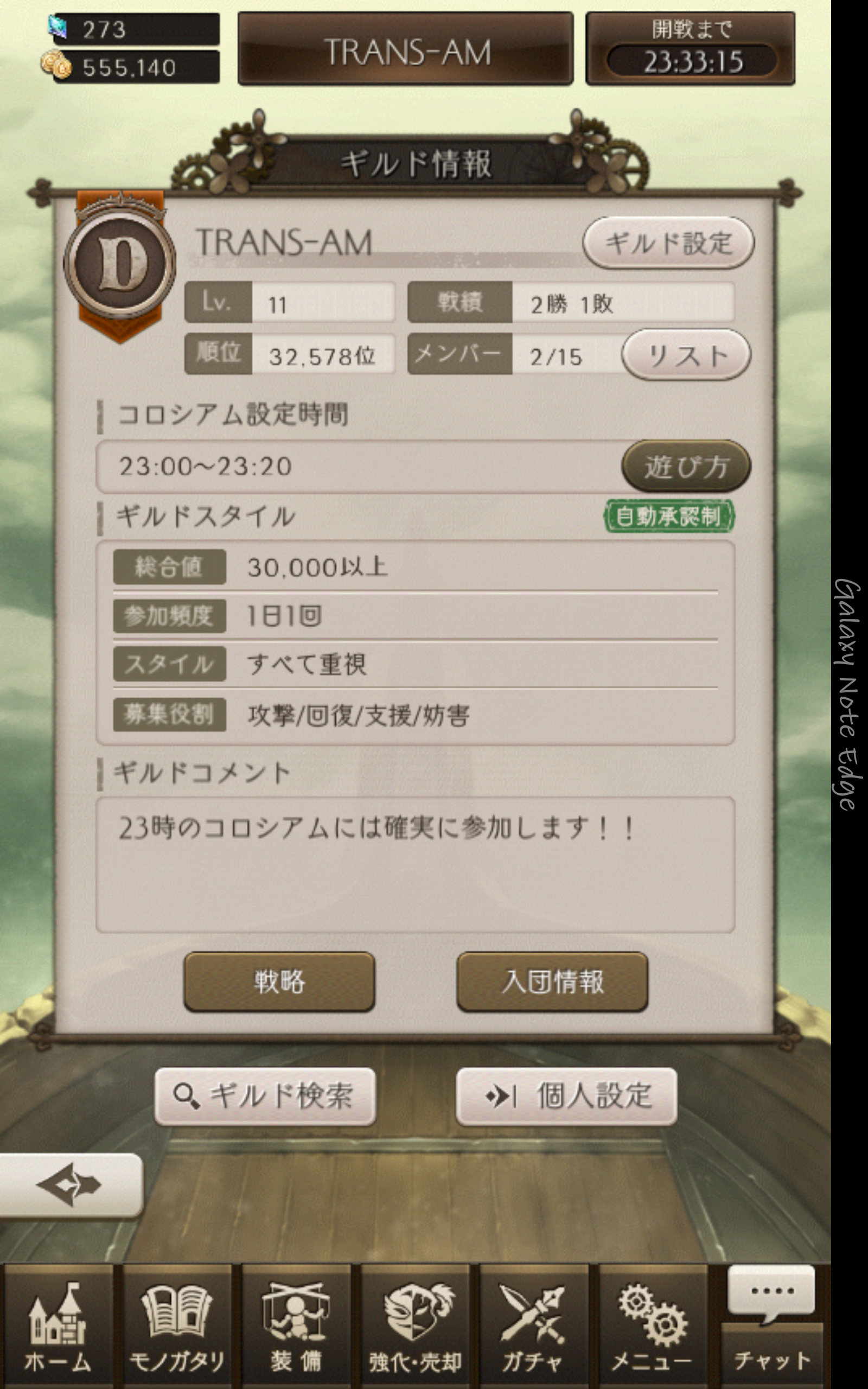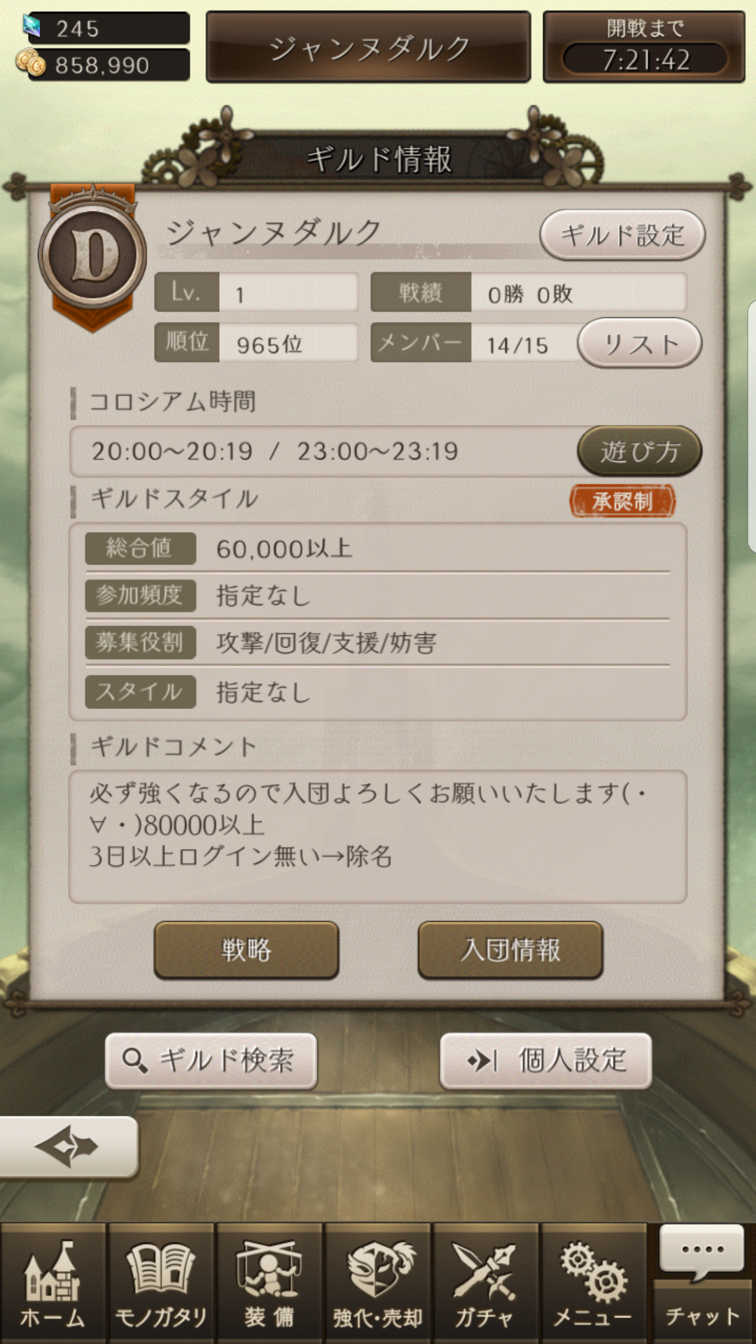 シノアリスではコロシアム(15対15のギルドバトル)へ参加する為にはギルドを作成するか、任意のギルドに加入する必要があるので、ぜひギルドに加入しておくことをおすすめします。