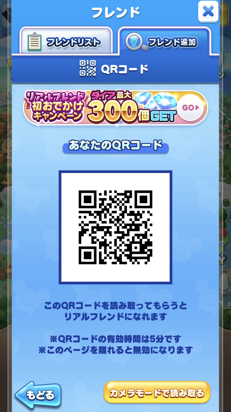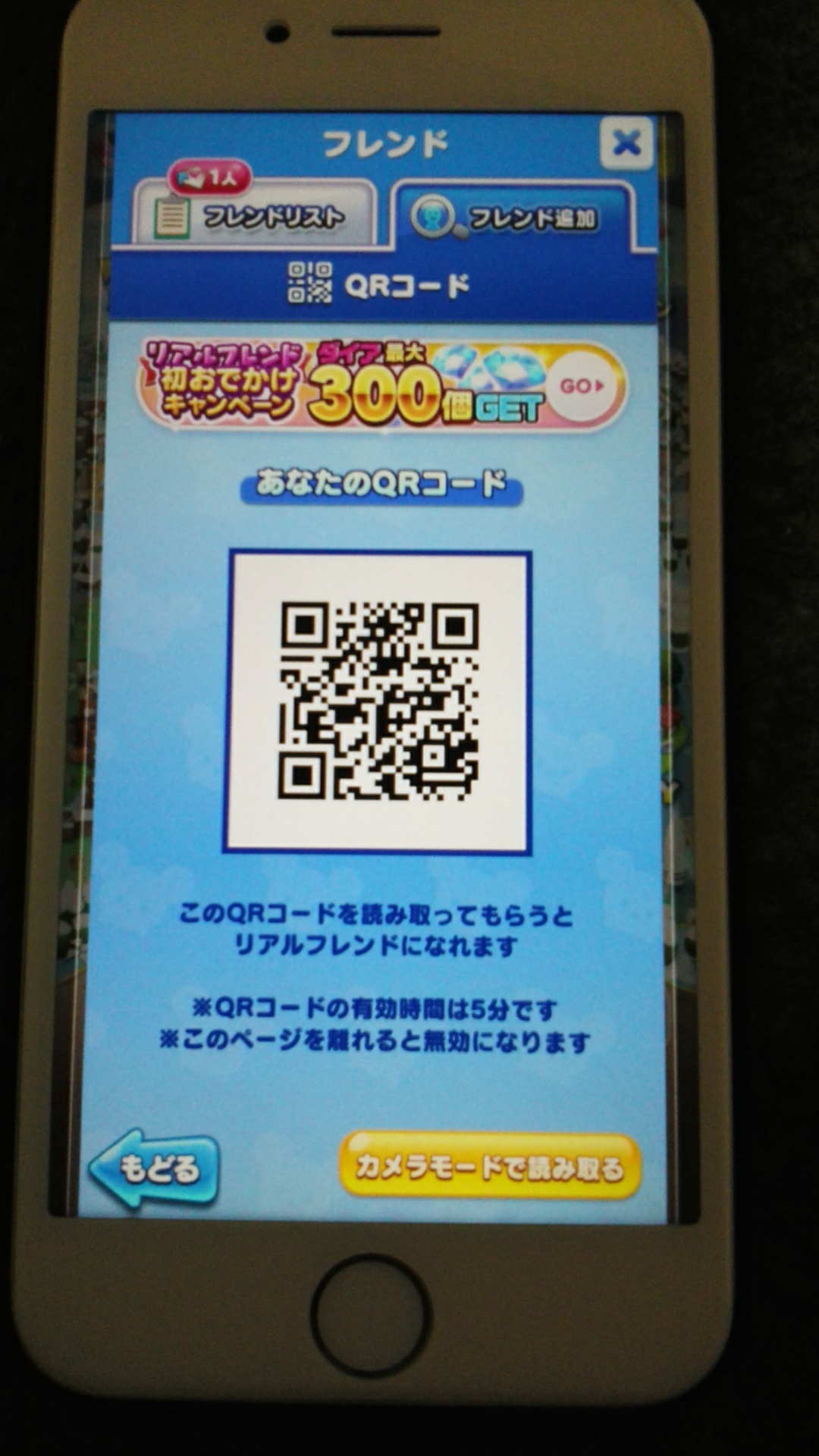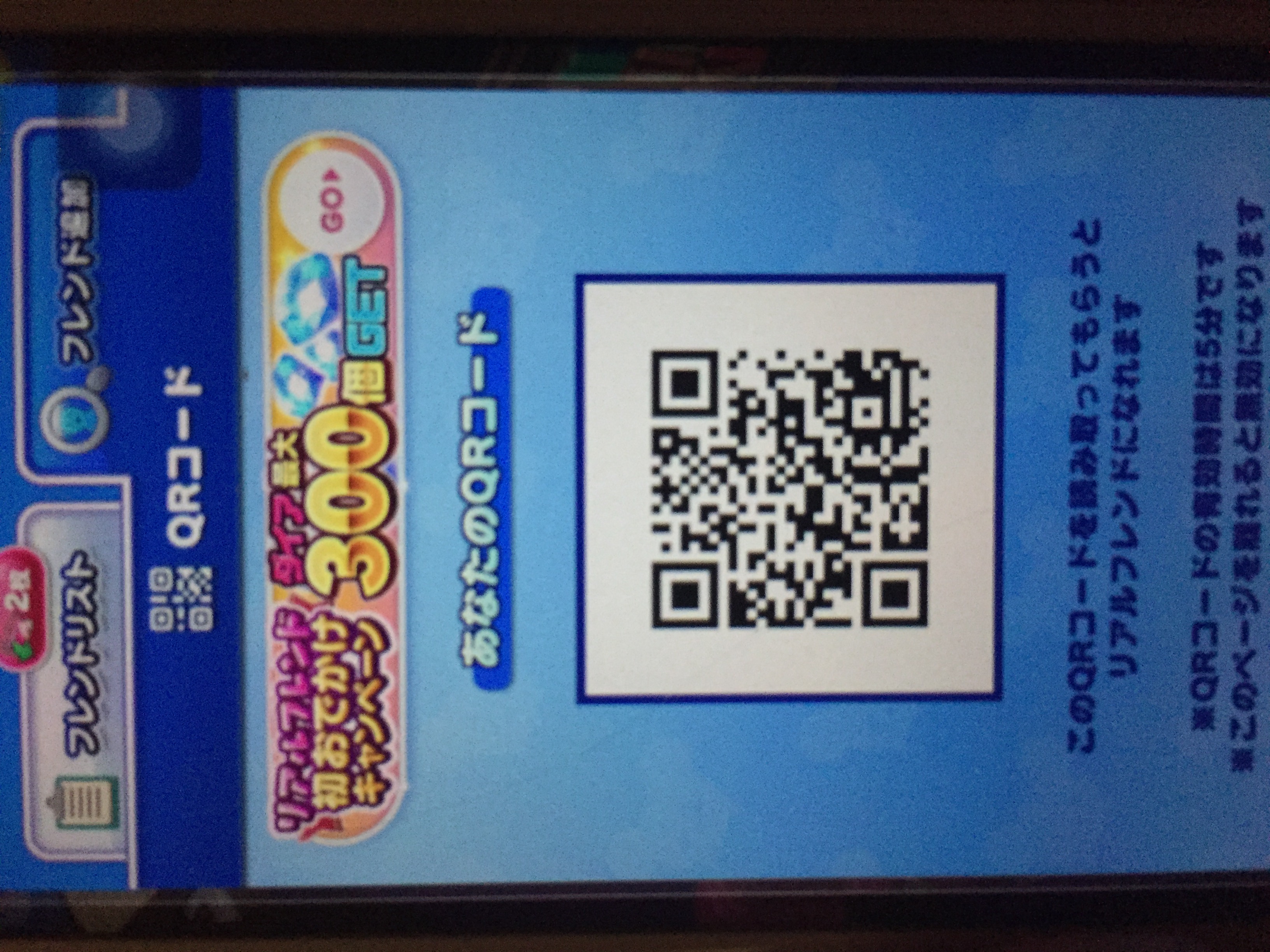 フレンド ⇒ QRコードでリアルフレンド追加 ⇒ 自分のQRコードを表示 ⇒ QRコードを発行する