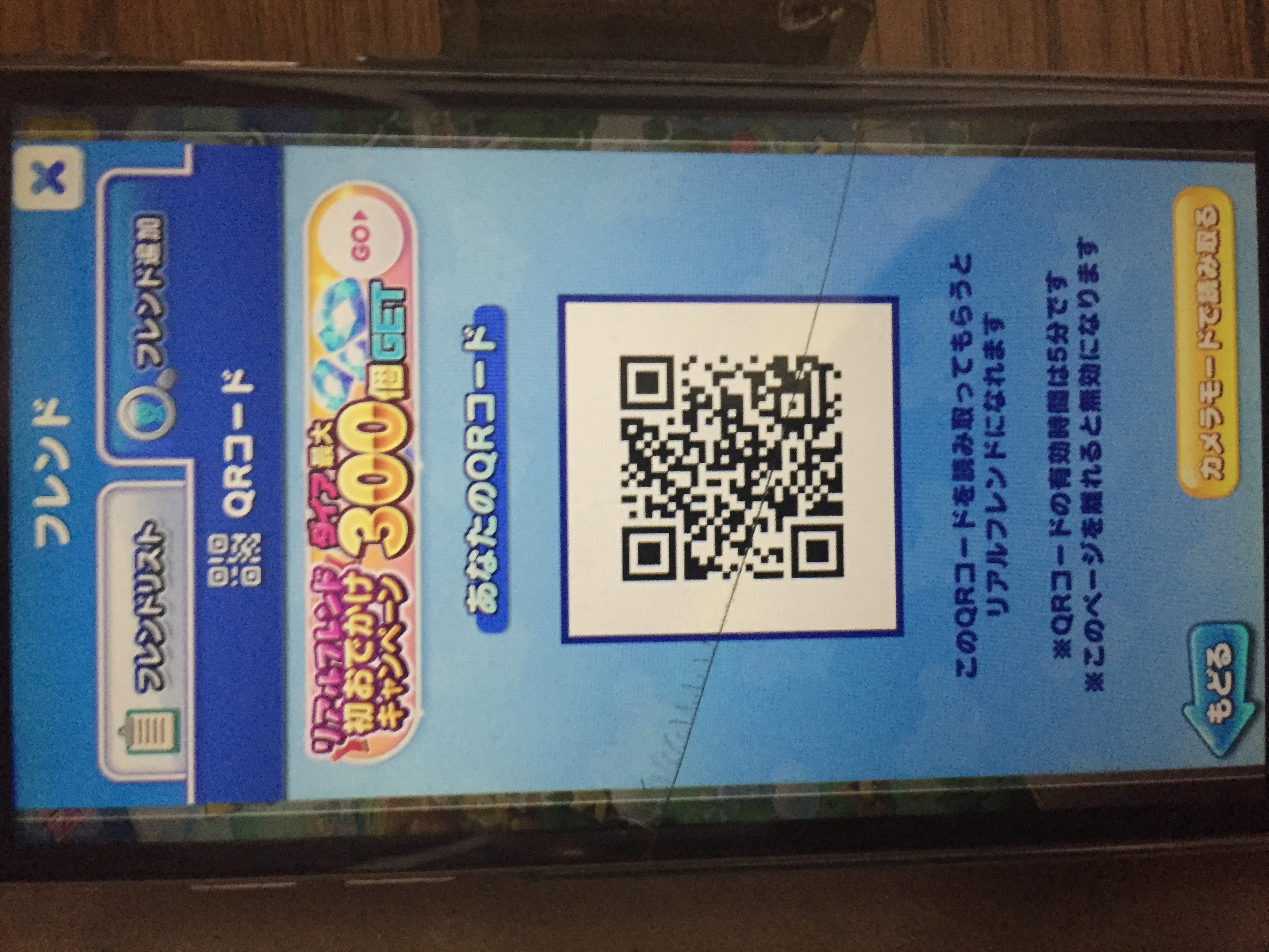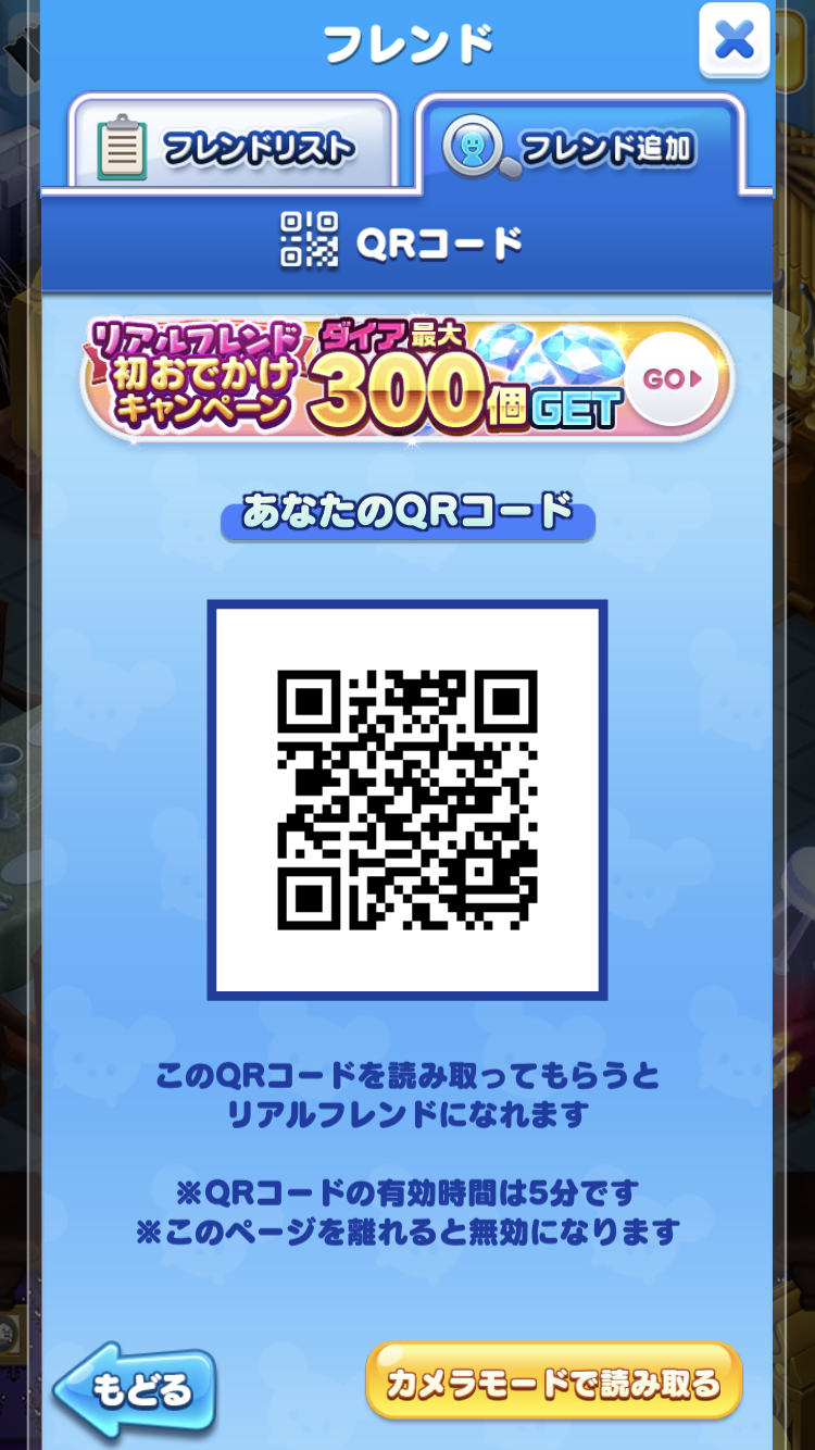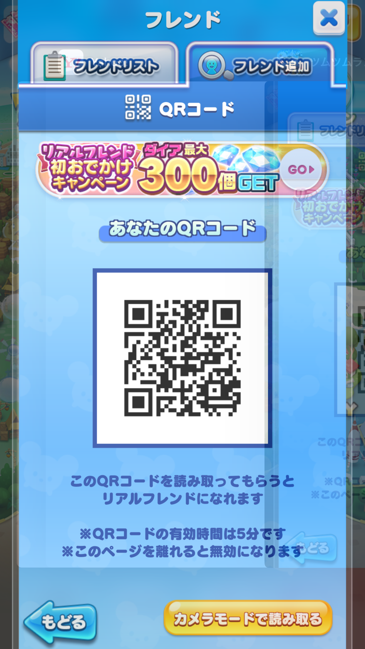 フレンド ⇒ QRコードでリアルフレンド追加 ⇒ 自分のQRコードを表示 ⇒ QRコードを発行する
