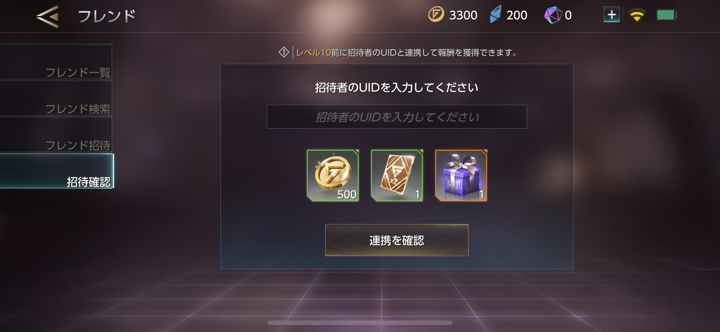 招待される側はホーム画面ヘッダーのフレンドアイコン⇒招待確認から招待した人のUIDを入力します。
