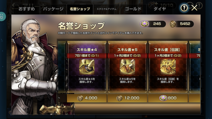アリーナの名誉ショップでは名誉ポイントや古代コインでスキル書が販売されています。