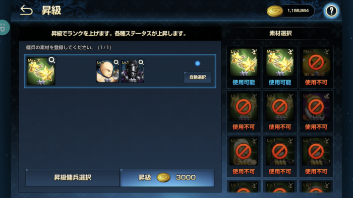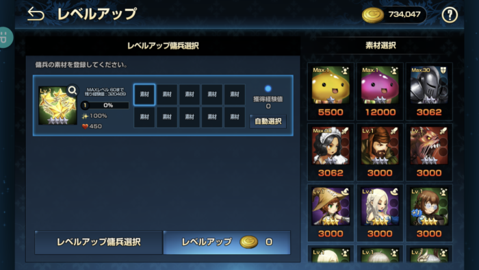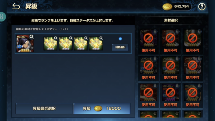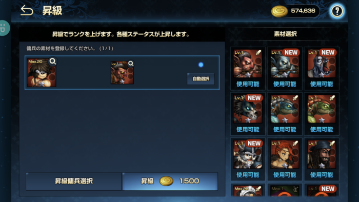 昇級には同ランクの傭兵か素材をランクの数だけ消費します。素材のレベルは1のままでOKです。