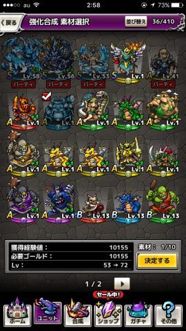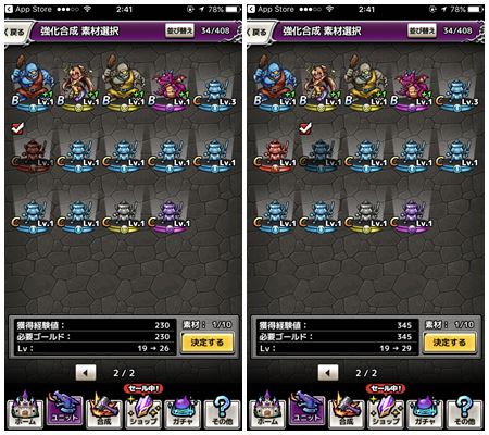 ユニットの強化合成は強化するベースユニットと素材ユニットを選び、コインを消費して行います。