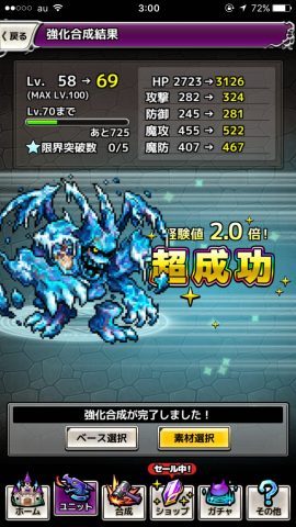 大成功による経験値の溢れに配慮して、ユニットのレベル上限が近づいたら一気に合成するのではなくこまめに合成することで少しだけ強化素材を節約できます。