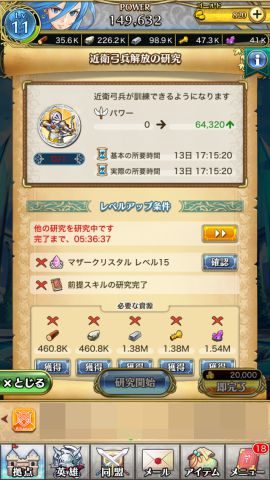軍事の研究の下方に位置しており、最低でもマザークリスタルのレベルが15必要となります。