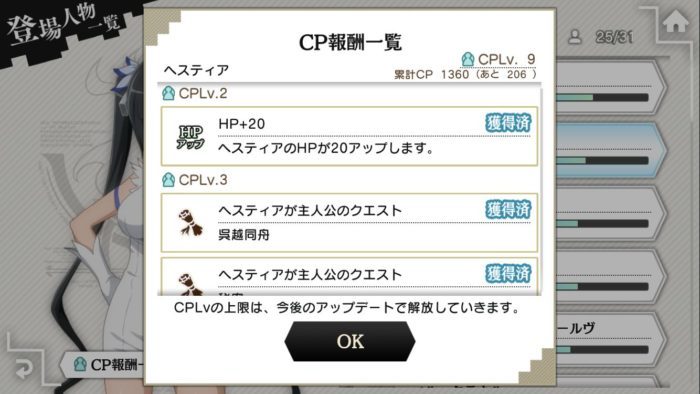 CPが一定値になりCPLvが上がることで、ステータスの上昇、報酬アイテムの獲得、キャラクエの解放などの恩恵があります。