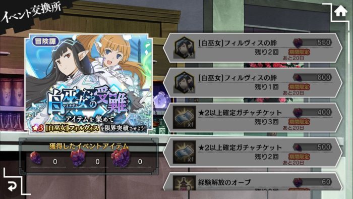 [白巫女]フィルヴィスの本体はクエストのクリア報酬で手に入り、交換所では前編、後編合わせて5つの絆を交換でき、全ての絆を交換すれば[白巫女]フィルヴィスを最終の5段階まで限界突破(5凸)できます。
