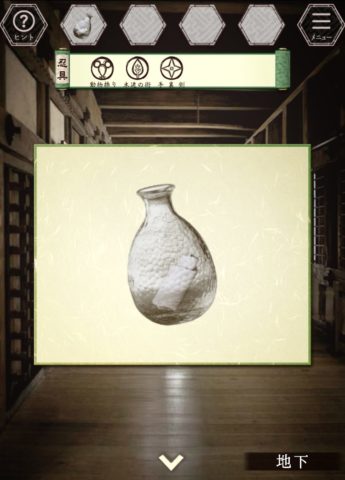 追っ手を撒いた後、武具の「手裏剣」を天井から吊るされたとっくりにドラッグし、紐を切って入手します。
