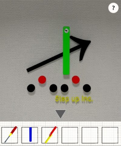 「赤い棒と黄色い棒をつないだ棒」を使って企業ロゴの下の丸の配置と合うようにブレーカーを操作します。(赤が「入」、黒が「切」)