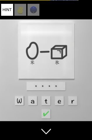ライオンの右の米(rice)-氷(ice)の絵の下の「Water」の文字の「r」を押し、チェックボタンを押します。