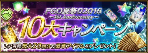 2015/7/30にAndroid版がリリースされ、本日(7/30)で1周年を迎える「Fate/Grand Order」(FGO)において「FGO夏祭り2016~1st Anniversary~」が始まりました。