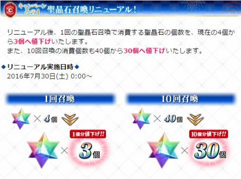 7/30(土)の0:00には早速「聖晶石召喚」(ガチャ)に必要な聖晶石が定常的に「4個」から「3個」に値下げされ、多くのユーザーから喜びの声が上がっています。
