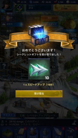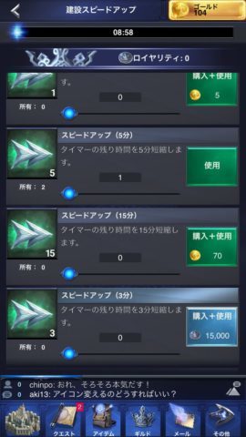 施設の建設やアップグレードには時間がかかり、スピードアップアイテムを使って時間を短縮することができますが、残り時間が5分以内になると無料で即時完成できるので、アイテムを使って時間短縮する場合は、残り時間が5分に近くなるように調整すると効率的です。