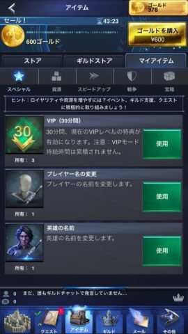クエストには王国クエスト以外に時間経過だけで達成する「英雄クエスト」、「ギルドクエスト」、「VIPクエスト」があるので、積極的にクリアしましょう。