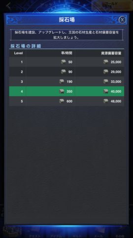 施設はアップグレードにより資源の生産量や備蓄容量が上がります。