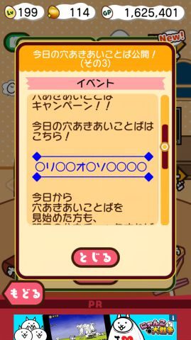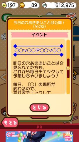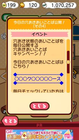 期間中にお知らせ内で表示される穴あき状態のあいことばを推測し、金のきらきらをGETしちゃいましょう♪