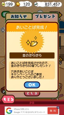 あいことばを完成させたので、金のきらきら50個もらえちゃいました^^