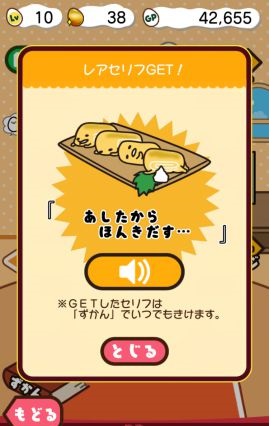 レアなセリフを集めると新しいぐでたまMENUが増えたりするので、気長にぷにぷにしよう。
