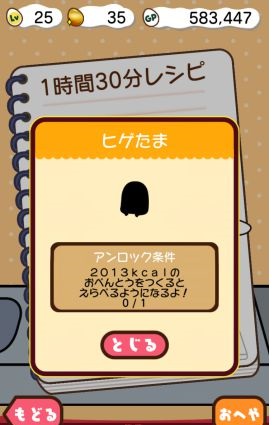 最初に作れる「まないた」レシピでぐでたまを調理していくと、「フライパン」や「なべ」で調理出来るMENUが増えます。