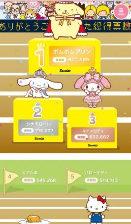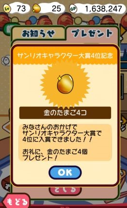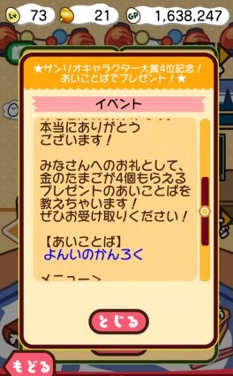 サンリオキャラクター大賞4位入賞のプレゼントとして、ユーザーの皆さんに「金のたまご4個」がもらえるあいことばが発表されました♪