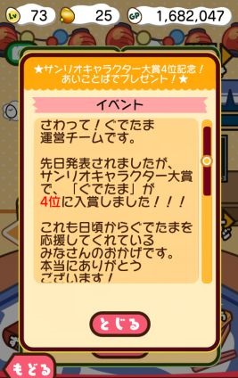 ぐでたまSのアプリ内では★サンリオキャラクター大賞4位記念!あいことばでプレゼント!★キャンペーンが開催されています♪