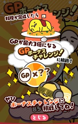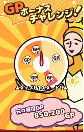 GPボーナスチャレンジとは、ぐでたまを作った際に獲得できるGPを増やすルーレットに挑戦!上手くいけばGPが数倍に増えちゃうんです♪