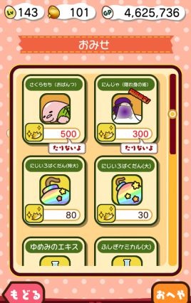 おみせには、金のきらきら500個で交換できる「さくらもち(おぱんつ)」と、金のきらきら300個で交換できる「にんじゃ(隠れ身の術)」が新登場!
