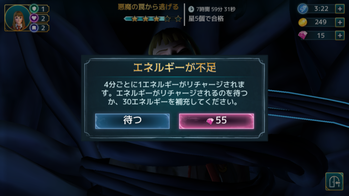 エナジーが無くなったら、時間経過でエナジーが回復するのを待つか、ジェムを使って回復するかで進めましょう。