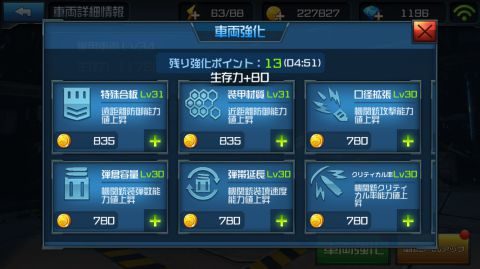 ▲車両強化では機関銃と車両の装甲を強化できます。