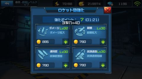 ロケット砲で強化出来るのは4か所で、それぞれで伸びるパラメータが違います。