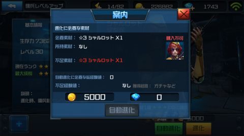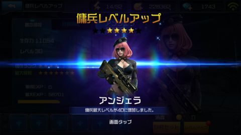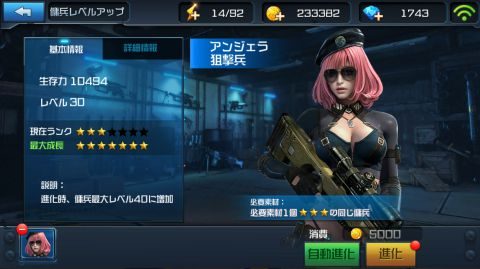 今回は星3狙撃兵の「アンジェラ」を進化させ、最大レベルが30から40に上がりました。