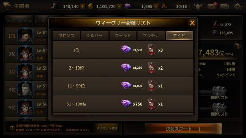 時間終了時点で勝点が多い順にウィークリー乱闘ポイントがもらえます。