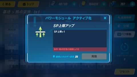 SPの上限はデフォルトで20ですが、艦長レベル18で解放される「基地」の「拠点空港」にはSP上限を引き上げる「パワーモジュール」もあります。