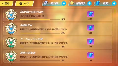 実績には達成報酬として水晶がもらえるものが多く用意されています。