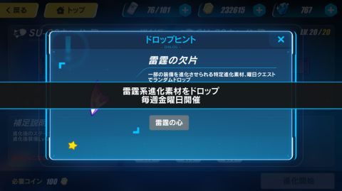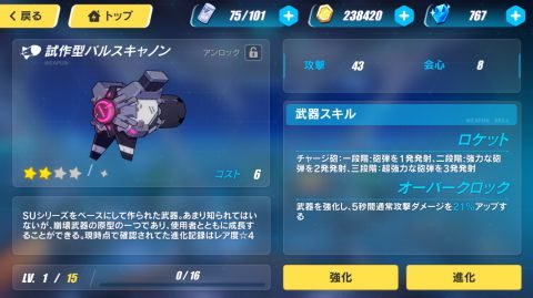 進化をすると武器のレベルは1に戻り強化するまでは弱体化してしまうので、主力の装備を進化する場合は強化素材を用意してから進化することをおすすめします。