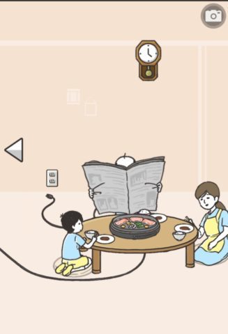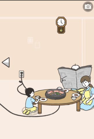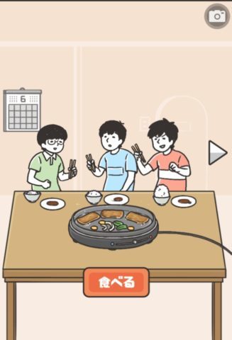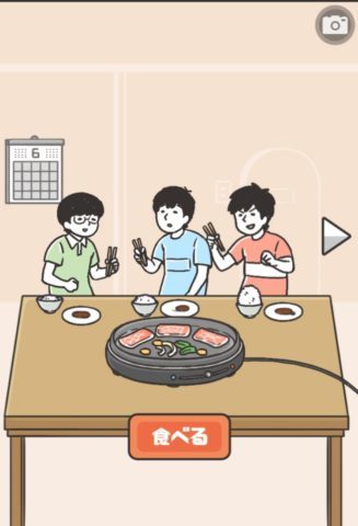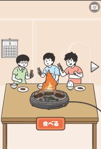ホットプレートの温度が強いまま、隣の画面のお父さんの後ろのコンセントを入れて肉を食べます。