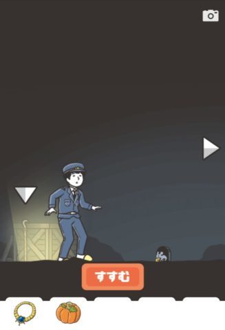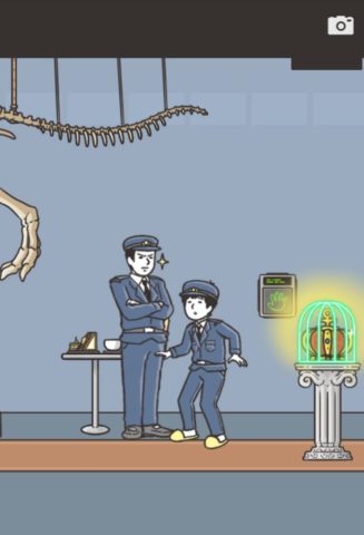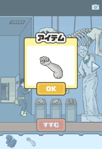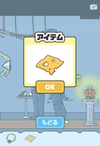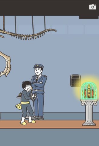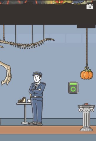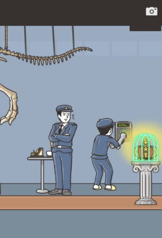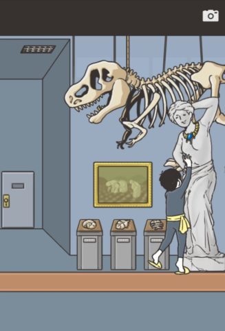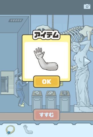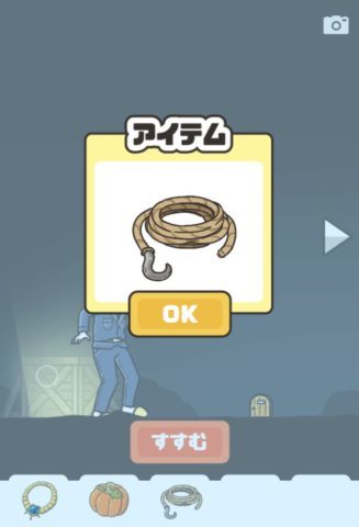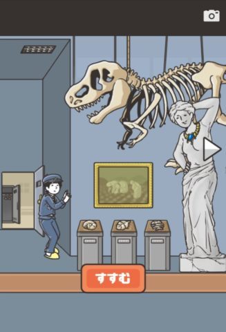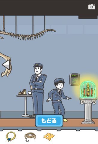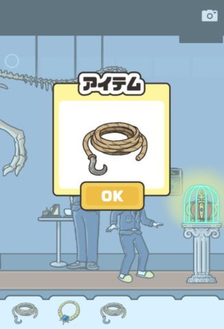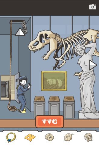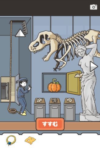 警備服に着替え、女神の像のネックレスと恐竜を吊るすロープを手に入れて先に進み、右の画面で恐竜を吊るすロープを手に入れれば達成です。