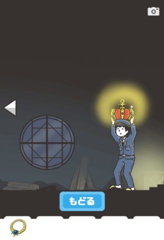 窓ガラスを割って逃げれば脱出成功です。(「もどる」は押しません。)